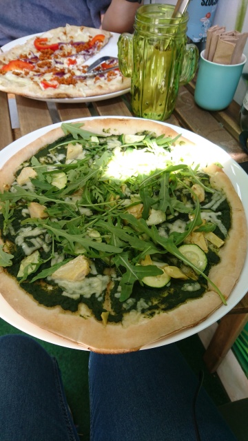 I went for the Green Gorilla Pizza with gluten free dough (spinach , zucchini, artichokes, arugula, and a bit of vegan cheese) , whereas my better half chose a Hungarian pizza (with vegan sausage, red onions, red bell peppers, and more). There are lots of other options, including a pizza of the month!