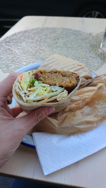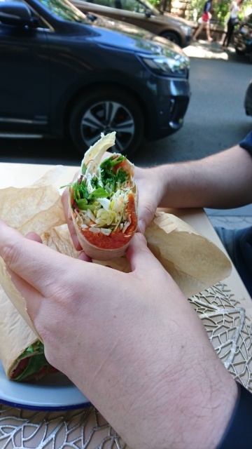 I went for a pumpkin falafel wrap – it was highly recommended in the reviews – and hubby got a couscous spicy wrap. The food was amazing and filling. But they don’t have any beverage choice – so hubby got tap water while I still had some elderflower juice from a place we stopped at that day.