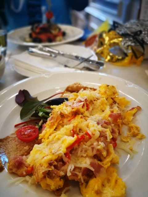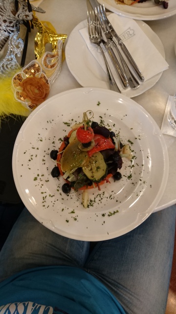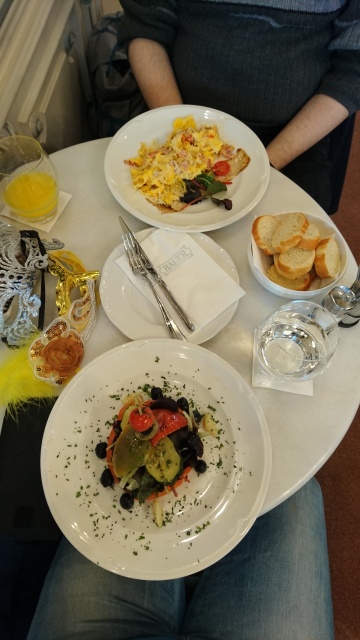 But we checked the prices and they were affordable. So then we tried to figure out what to order. My better half got an omelet and orange juice and I got grilled veggies with salad. And water (on the house). Of course, A. also wanted sweets. He asked if they carry anything vegan but the answer was… “everything has eggs”. Oh well.